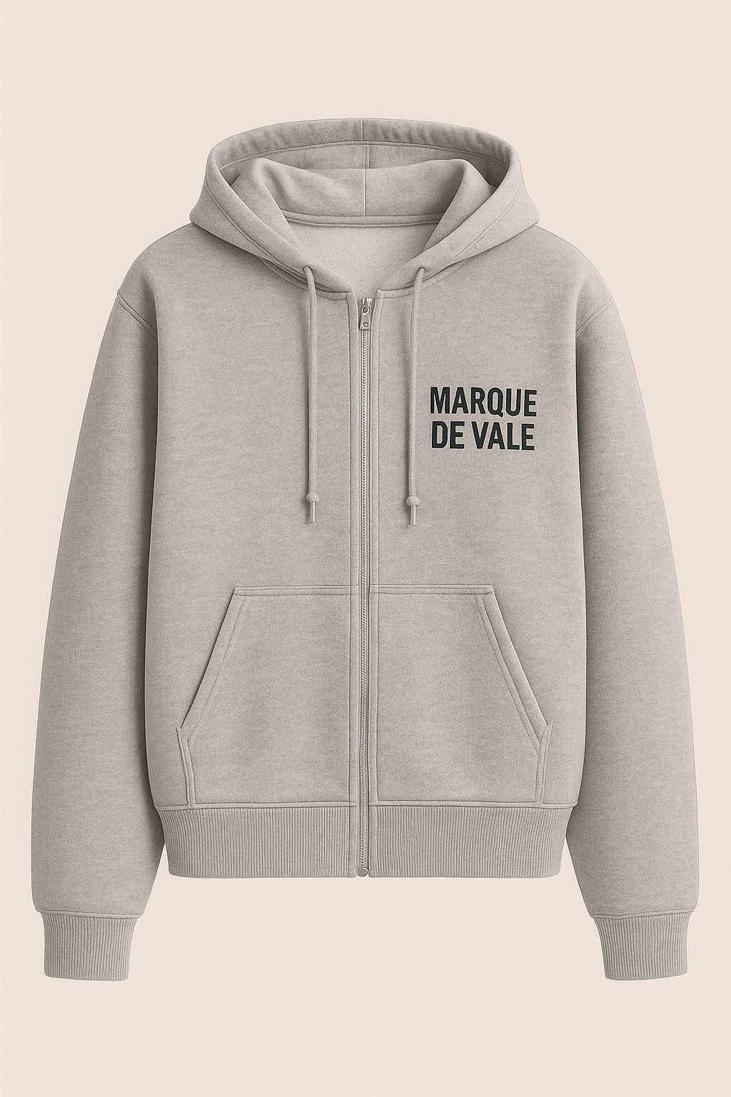 The Nova Hoodie – A heavyweight, boxy-fit oversized zip hoodie crafted for timeless wear. Designed in Sport Grey and finished with embroidered Marqué de Vale branding.